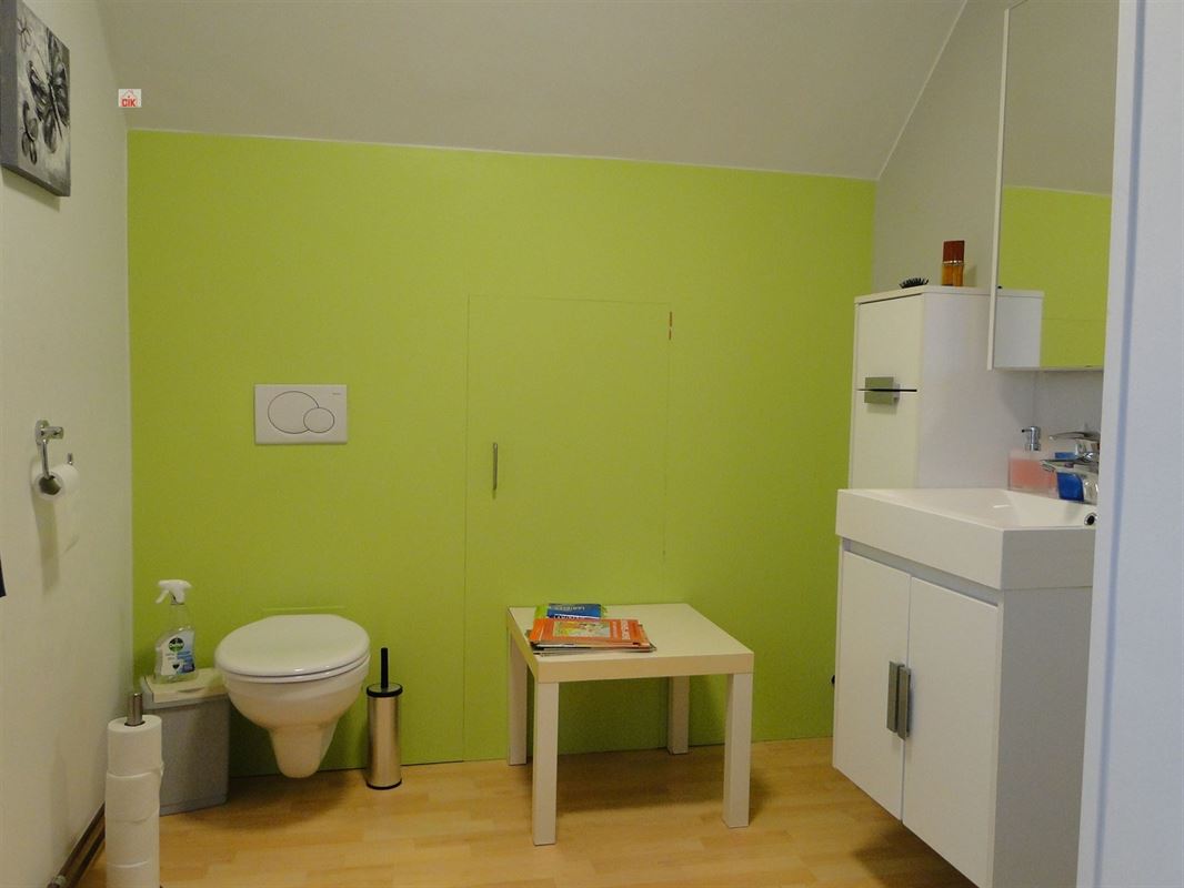 Op de eerste verdieping treft men twee grote slaapkamers + een baby- of bureakamer en een grote badkamer met ligbad en lavabo.